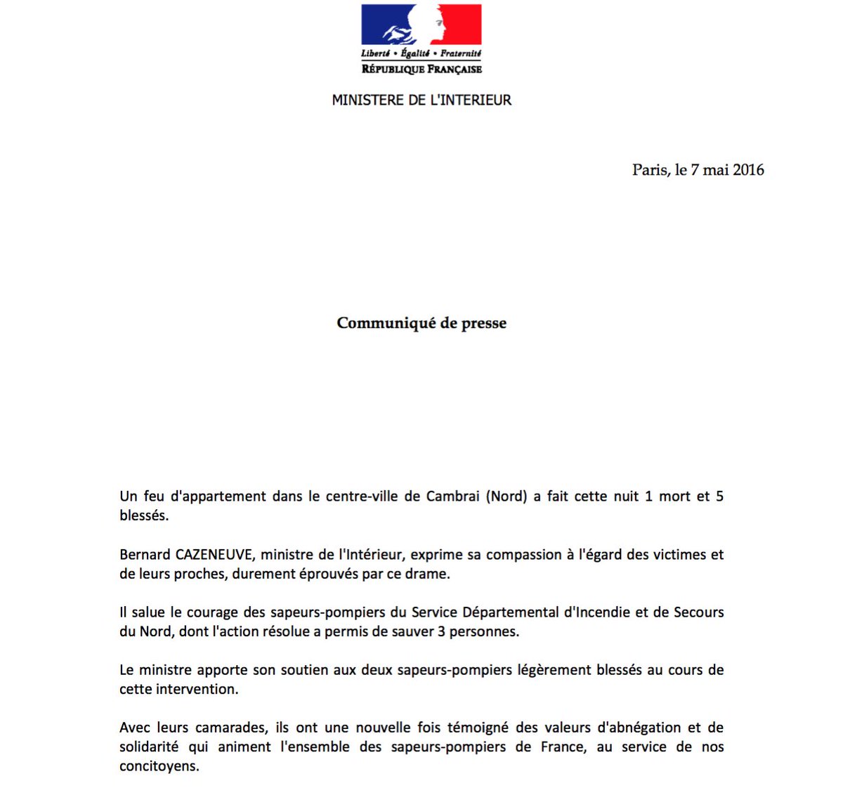 #Cambrai:@BCazeneuve exprime sa compassion & salue le courage des sapeurs-pompierspic.twitter.com/w4oFsgfBX6