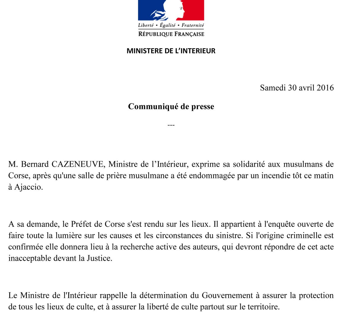 @BCazeneuve exprime sa solidarité aux musulmans de Corse après l'incendie d'1 salle de prière à Ajacciopic.twitter.com/woTUqlzUoG