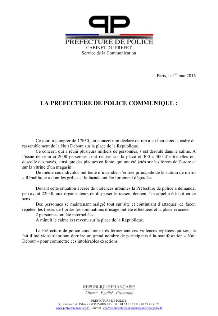 #manifestation#NuitDebout Incidents à République Consultez le communiqué de presse de@prefpolicepic.twitter.com/XzG4PYfsCX