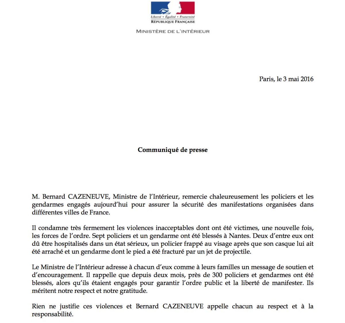 @BCazeneuve remercie chaleureusement les policiers et gendarmes engagéspic.twitter.com/ycJDZtq0oP