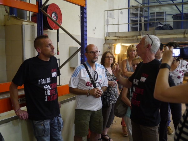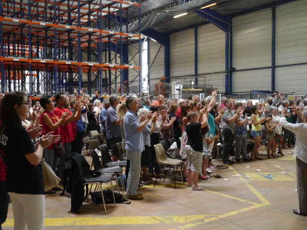 Ce vendredi 4 juillet, les Fralib ouvraient les portes de leur usine pour fêter leur victoire obtenue après 1336 jours de lutte. Au menu, visite de l’usine, théâtre joué par les Fralib eux-même sur leur lutte, meeting avec prises de paroles, buffet, Audrey Vernon et un concert jusqu’au bout de la nuit avec les Red Lézards, Thierry Leballeur, HK et les Saltimbanks, Los Fralibos et bien d’autres encore… Une affluence record, le parking de l’usine et toute l’avenue du Pic de Bertagne étaient remplis de voitures !